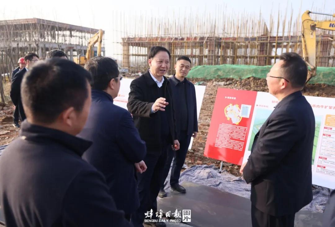 黃曉武書記現(xiàn)場察看施工進度,詳細了解項目進度、規(guī)劃設計等情況,陳建功董事長對項目建設和后期運營有關問題進行詳細介紹。黃書記對該項目建設表示充分肯定,強調要進一步加快建設進度,優(yōu)化運營模式,積極探索聯(lián)農帶農新模式,發(fā)展“智慧+生態(tài)”一體化肉牛養(yǎng)殖體系,要把鄉(xiāng)村產業(yè)發(fā)展擺在更加突出位置,下更大功夫抓好“糧頭食尾”“畜頭肉尾”“農頭工尾”增值大文章,充分發(fā)揮蚌埠優(yōu)勢,深入實施“秸稈變肉”暨肉牛振興計劃,加強高品質肉牛繁、育、加全產業(yè)鏈建設,加快肉牛產業(yè)轉型升級,為鄉(xiāng)村振興提供有力產業(yè)支撐。