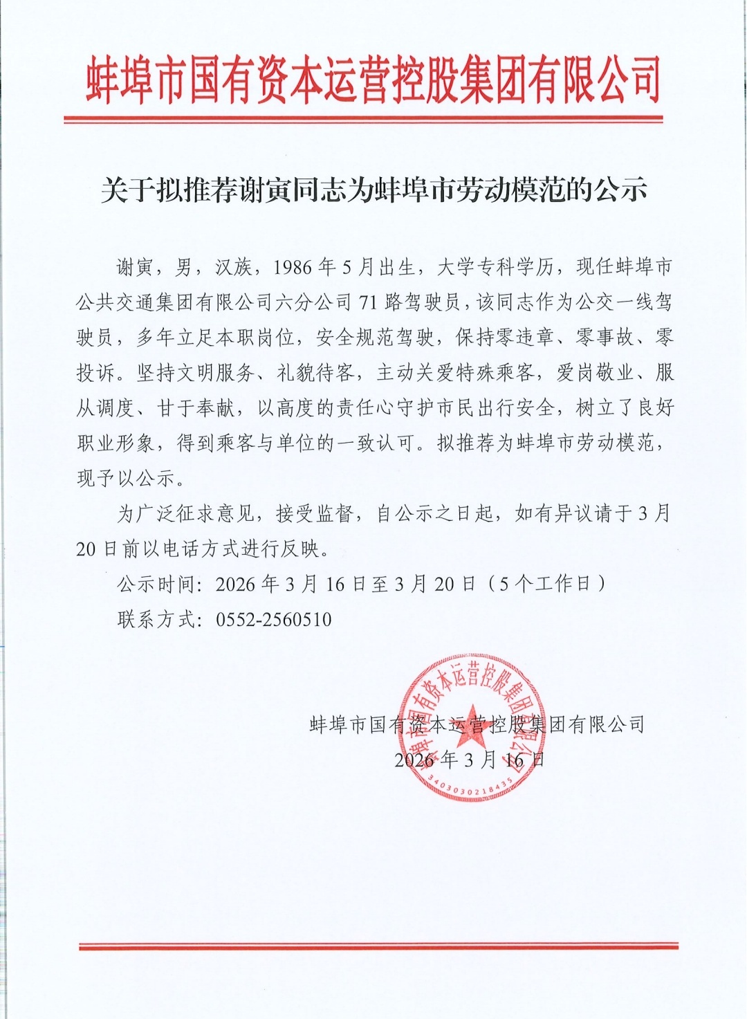 關于擬推薦謝寅同志為蚌埠市勞動模范的公示