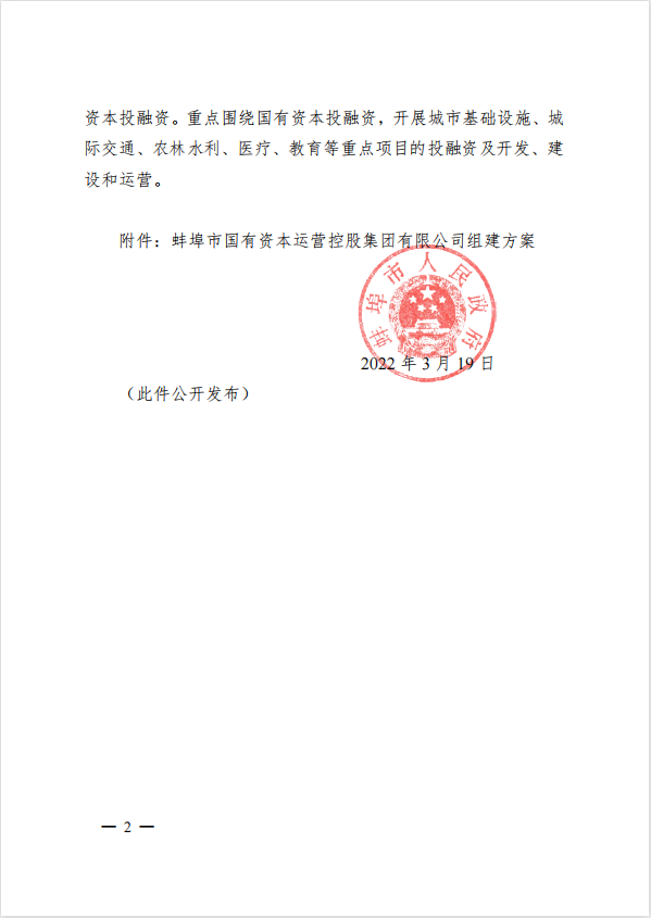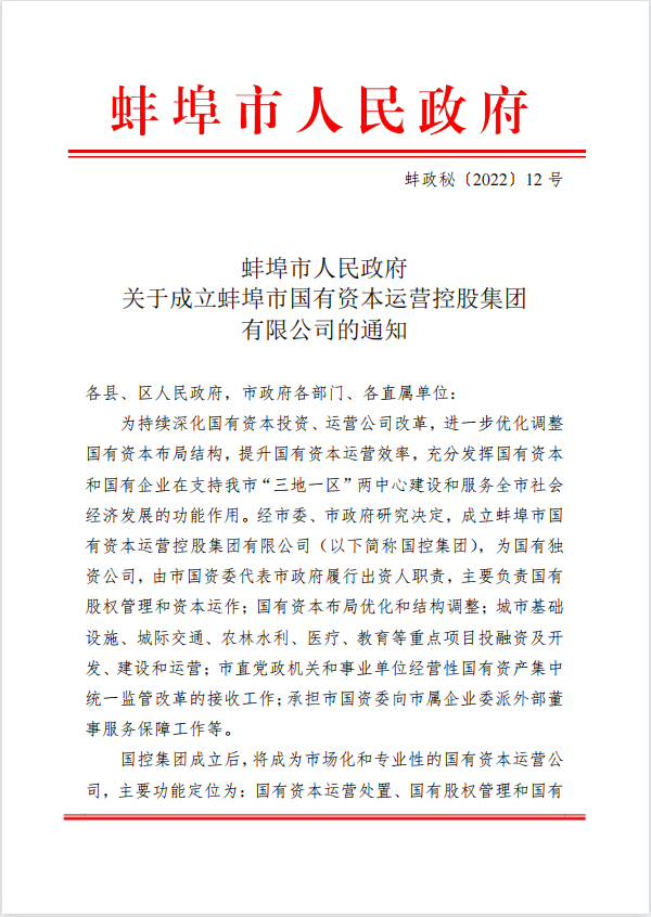 蚌埠市人民政府關(guān)于成立蚌埠市國有資本運營控股集團有限公司的通知